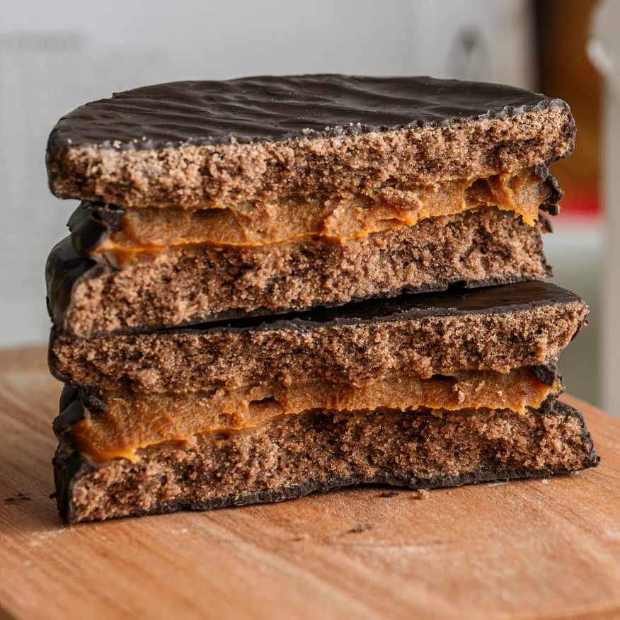 Alfajor de chocolate con relleno de dulce de leche con baño de chocolate negro.