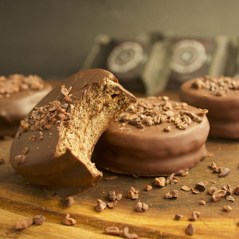 • Pasta de chocolate y nibs de cacao con harina de cacao recubierto de chocolate 65%