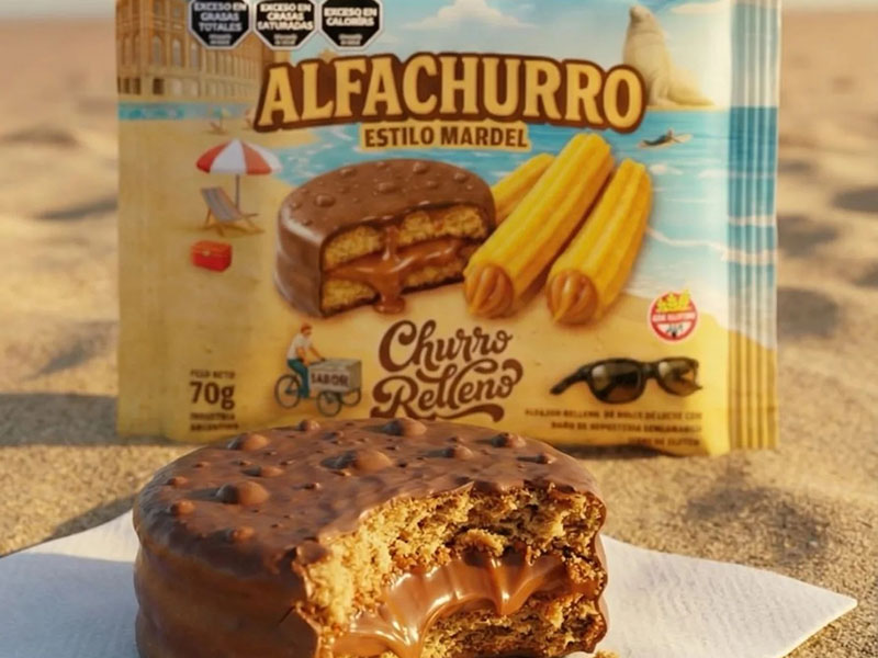 El Alfachurro es una innovación de la marca argentina Maixanas, que combina la textura y el sabor de un churro tradicional con la estructura de un alfajor.