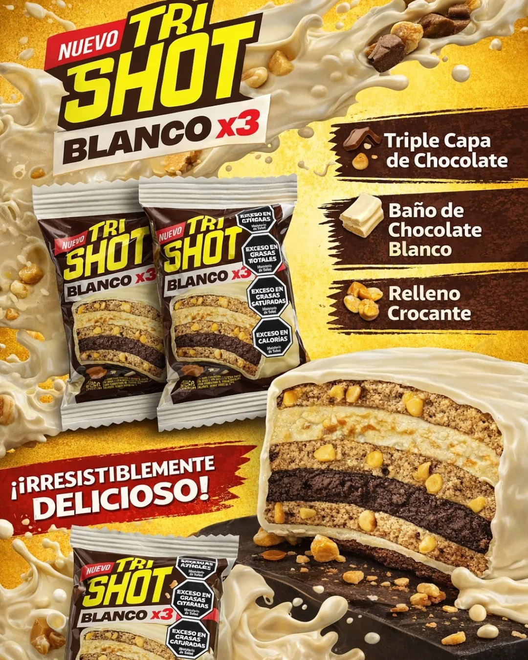 El alfajor Tri Shot Blanco es el lanzamiento más reciente de la línea Shot de Mondelēz, sumándose a la versión clásica de chocolate con leche. Se caracteriza por ser un alfajor triple que combina el sabor del chocolate blanco con la clásica pasta de maní.